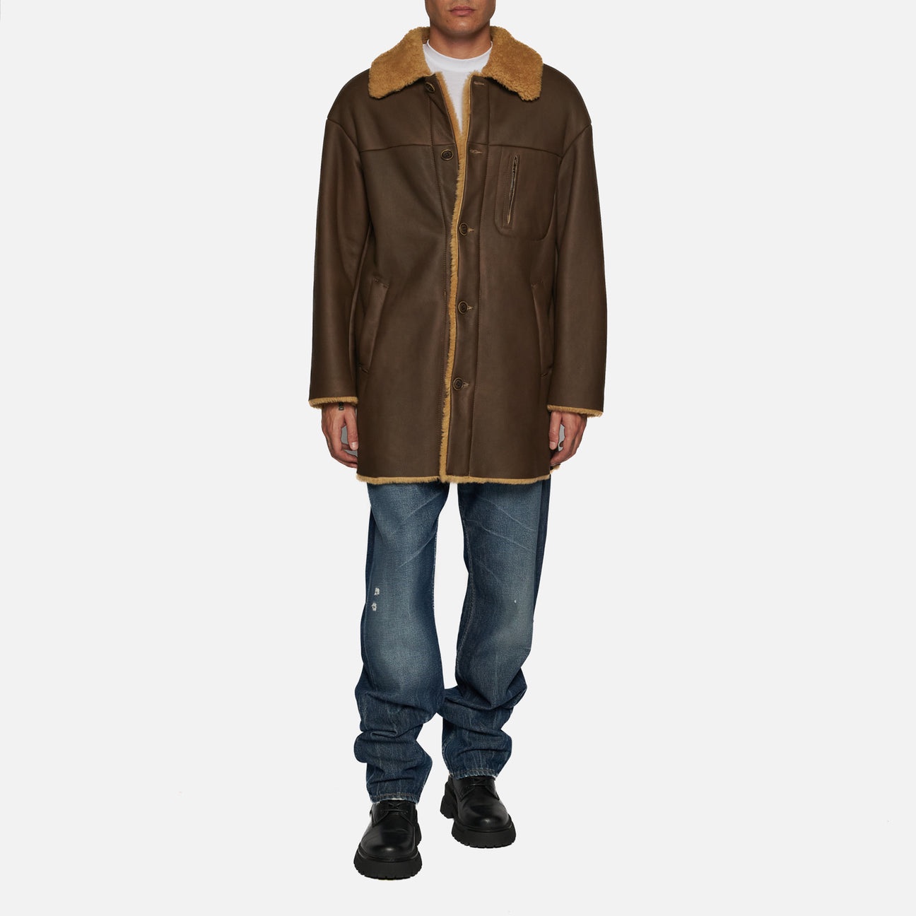 Brown shearling coat with soft inner fur trim and exposed details. This piece features a classic design with button closure, wide collar and turn-up cuffs for a refined and timeless look. Side pockets and a zipped chest pocket add functionality, making this coat ideal for colder days. Perfect for those looking for a combination of elegance and warmth in one piece.