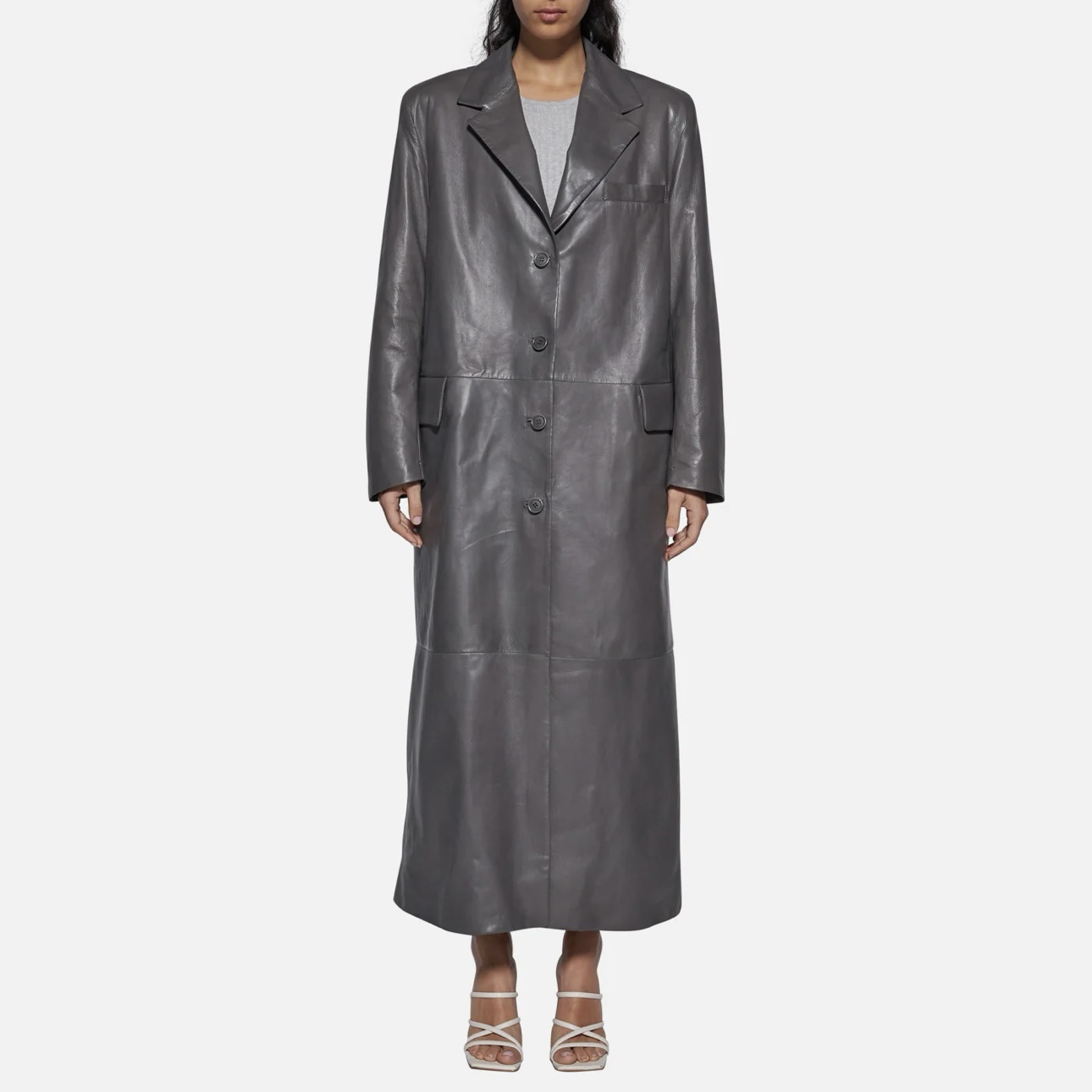 This dark grey plongé nappa coat is a perfect example of modern elegance. Crafted from high-quality leather, its linear and minimalist design with three-button closure makes it versatile and suitable for both formal and casual looks. The plongé leather, known for its softness and smooth finish, gives the garment a luxurious and sophisticated look. The flap pockets and tailored details enhance the functionality, maintaining an elegant and clean look. Ideal for those who want a timeless classy garment, perfect for facing the winter season in style.