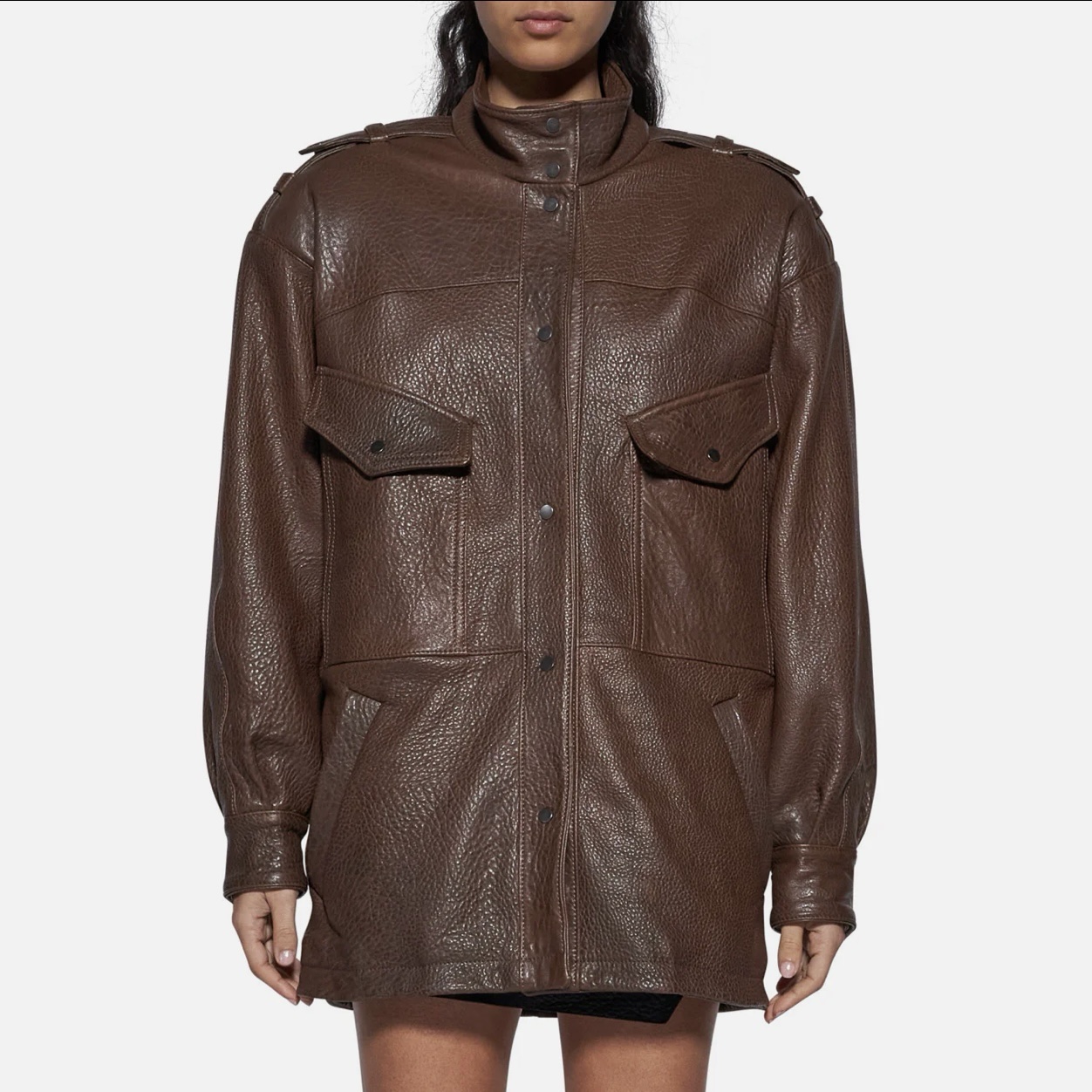 This brown leather jacket features a wrinkled texture that gives it a bold, modern look. Featuring large flap pockets on the chest and a snap button front closure, the design combines military style with a contemporary twist. The shoulder details and high collar add character to the piece, making it perfect for a casual yet sophisticated look.