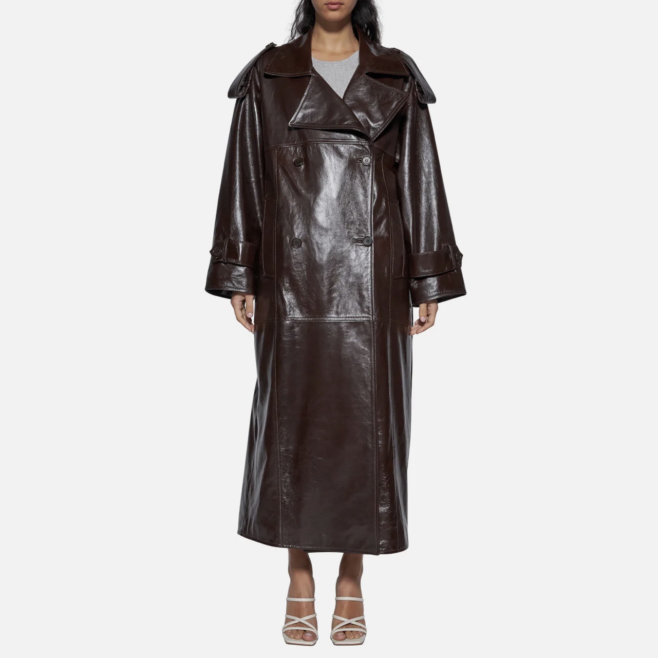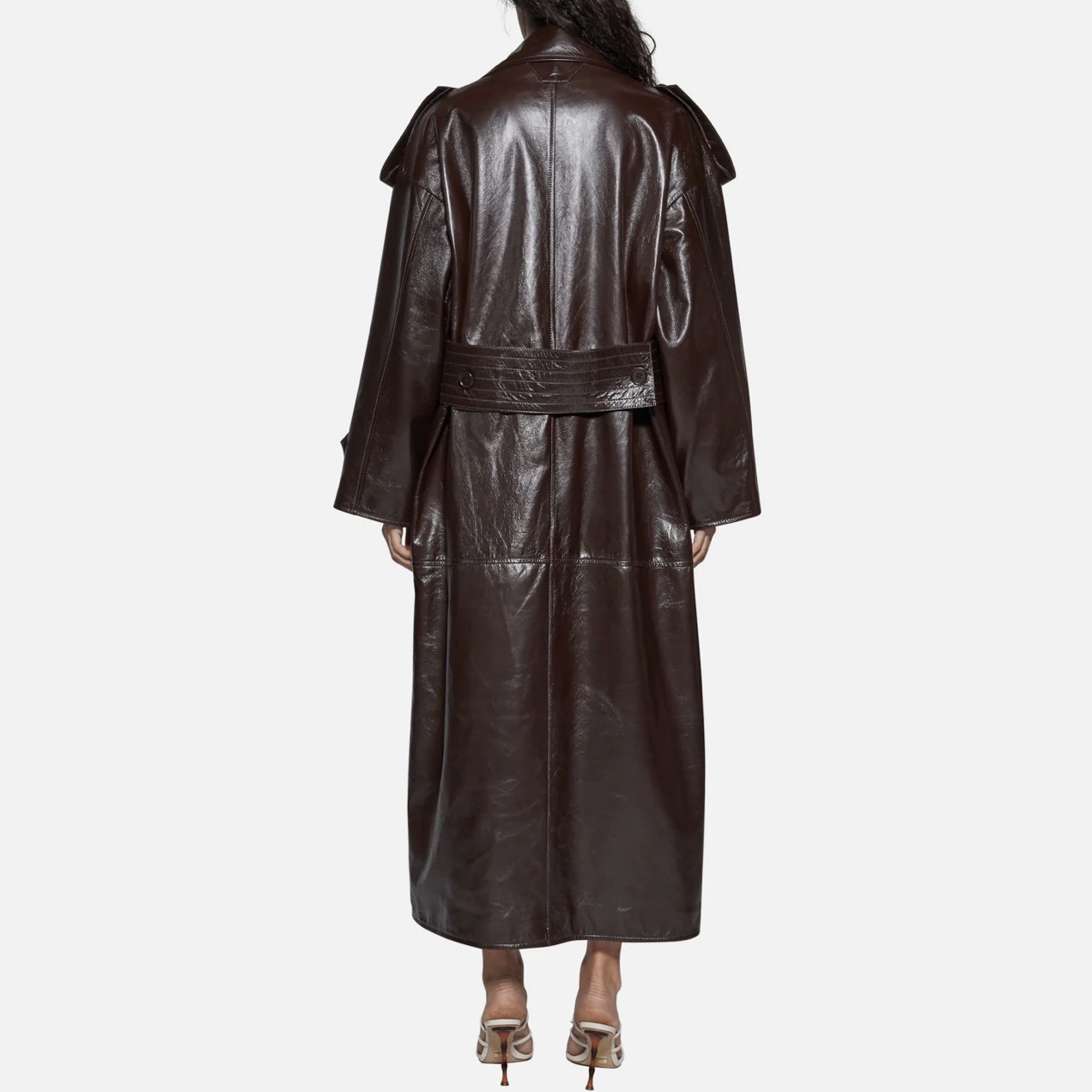 This brown shiny leather trench coat is a classic piece revisited for those seeking elegance and functionality. The double-breasted design, combined with the wide shoulder pads and the long cut, gives a structured and sophisticated look. The shiny leather adds a luxurious touch, making it perfect for those who want a piece that captures attention. Buckles on the cuffs and tailored details add character, while the functional pockets make it practical for everyday life.