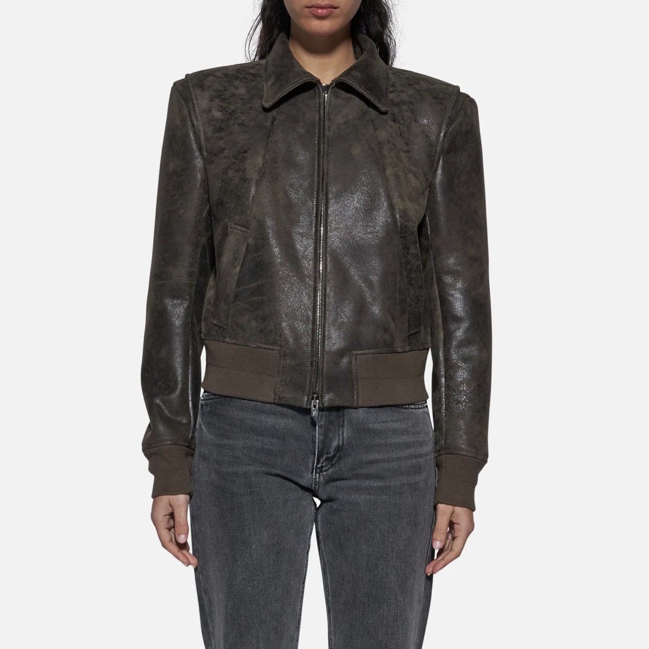 Crafted from distressed army-colored leather, this bomber jacket combines vintage style with a modern aesthetic. The treated leather material gives the piece a worn look, while maintaining a quality and durable feel. The zip closure and ribbed details on the cuffs and hem offer a comfortable fit and a contemporary look.