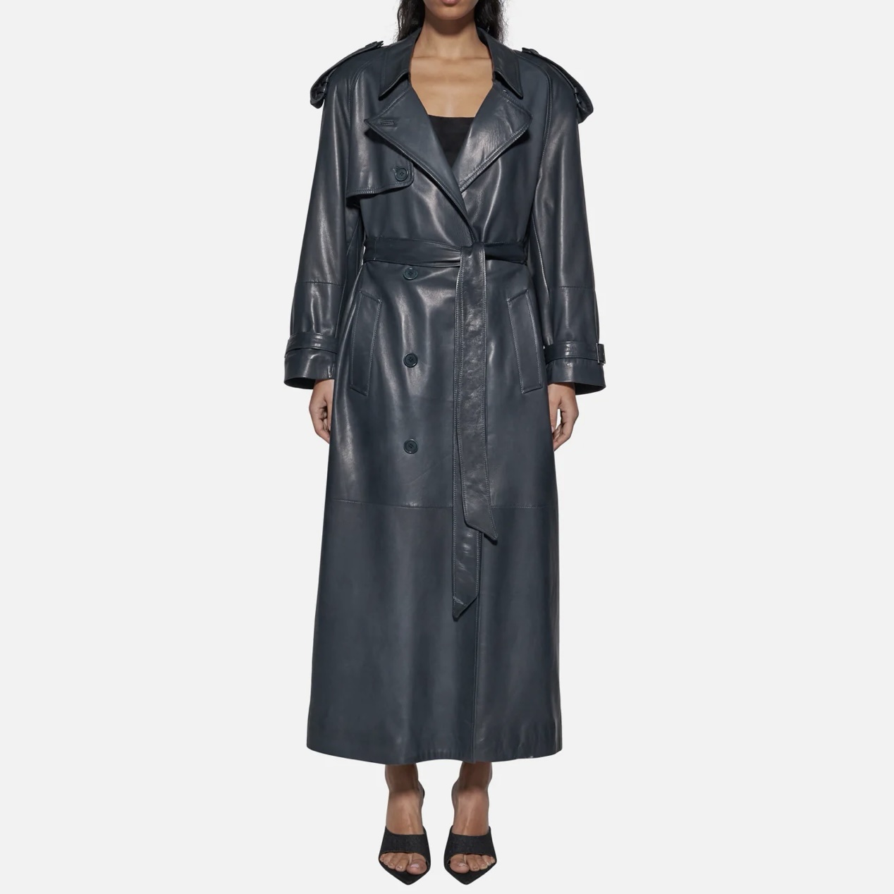 This piece represents a classic leather trench coat with a modern finish. Its asphalt grey color and belted waist emphasize an elegant silhouette, ideal for both formal and casual occasions. The double-breasted details and buckled cuffs add a sophisticated and functional touch, making it perfect for the autumn-winter season.