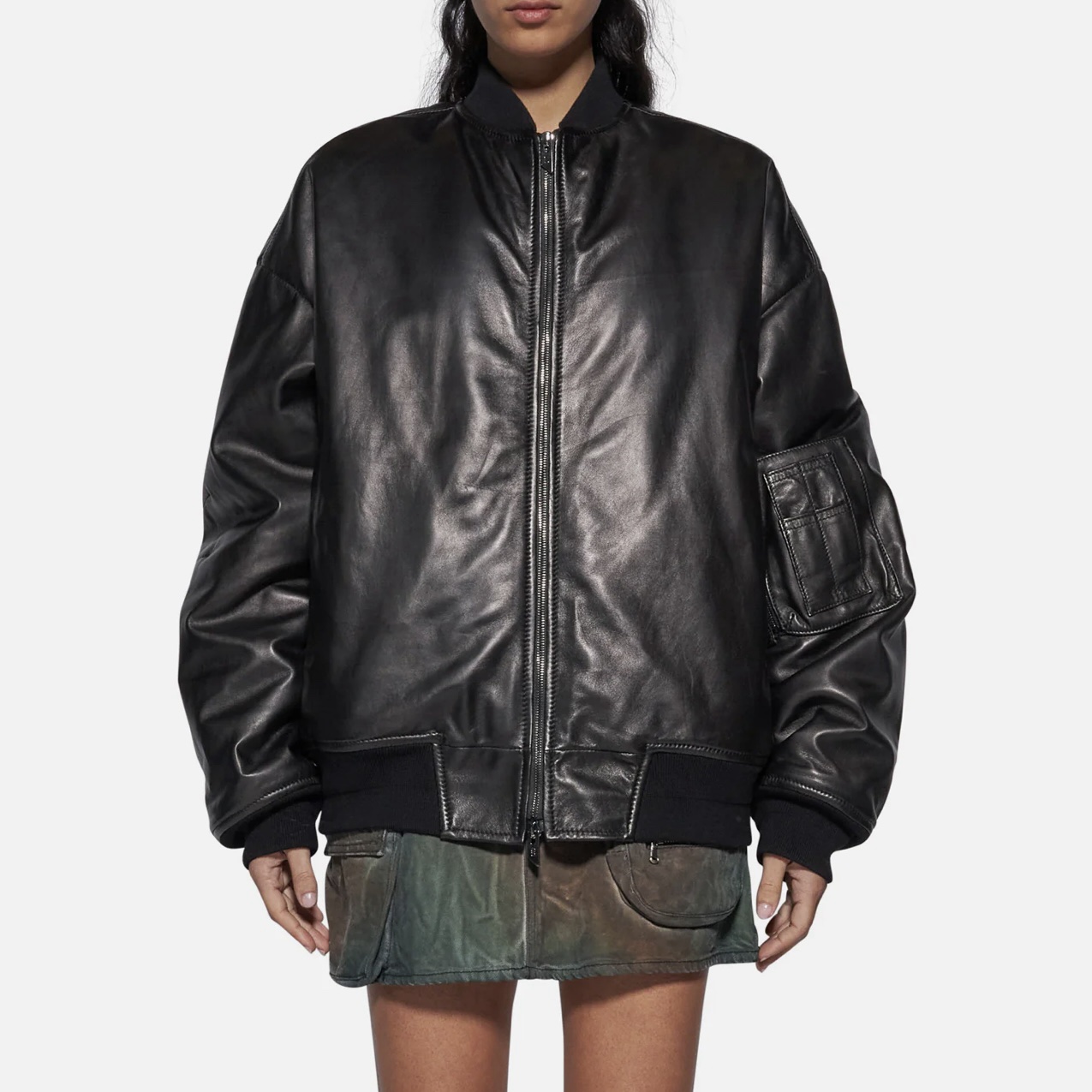 This black leather bomber jacket is an iconic piece that combines a clean design with functional details. Crafted from high-quality leather, it offers a comfortable and durable fit, ideal for facing the season in style. The elasticated knit collar, cuffs and hem ensure comfort and a snug fit, while the front zip and zip-detail pocket on the sleeve add a contemporary and practical touch. Perfect for an urban and versatile look, this bomber jacket is a must-have for those who want a garment that combines elegance and practicality.