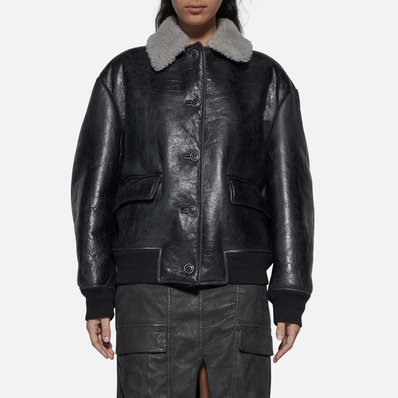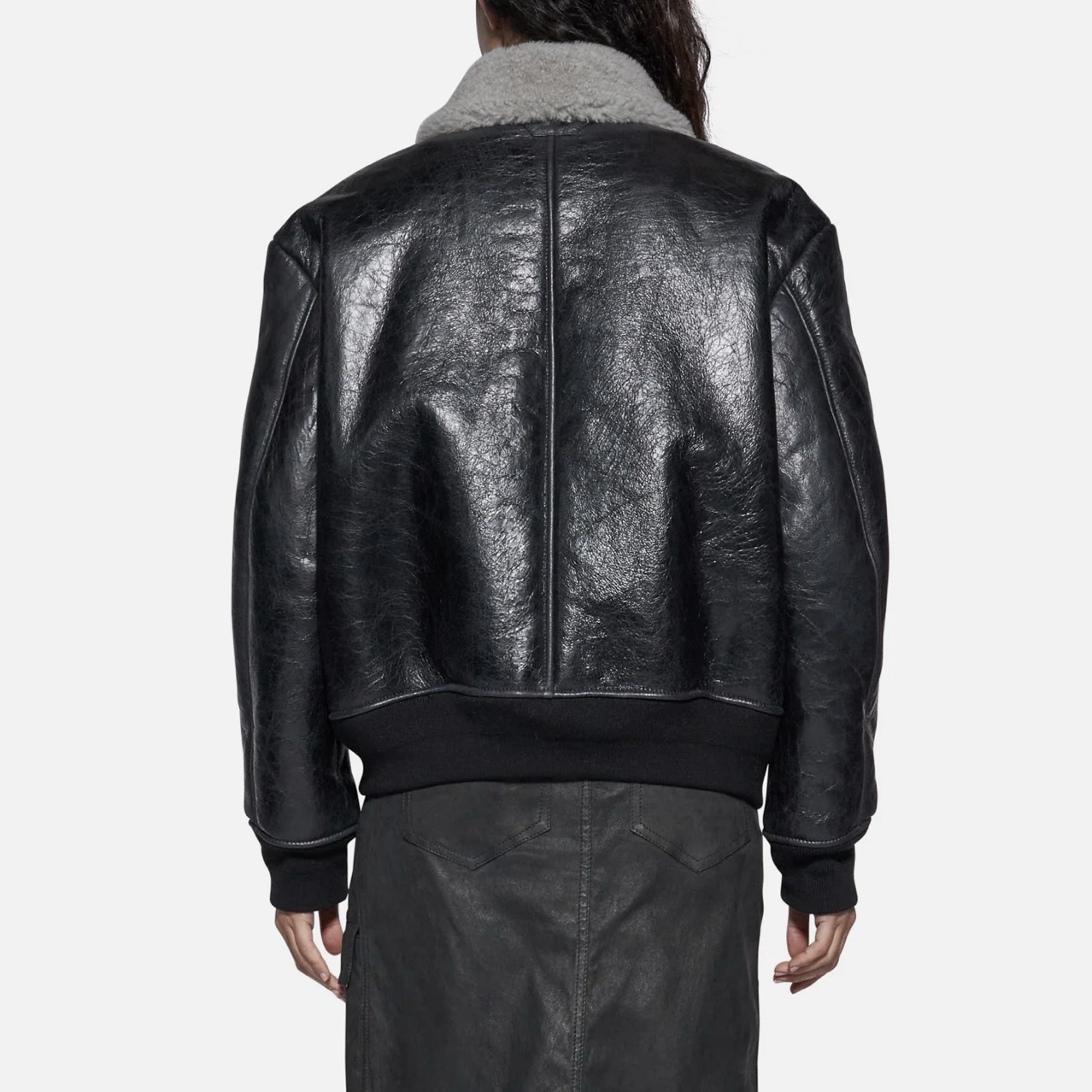 This black shearling jacket with grey sheepskin collar combines a classic design with maximum protection against the cold. Crafted from high-quality shearling leather, it guarantees warmth and comfort to face the winter season. The soft sheepskin collar adds a refined color contrast, while the button closure and front pockets add a practical touch. Ribbed trims on the cuffs and hem complete the design, ensuring a perfect and comfortable fit