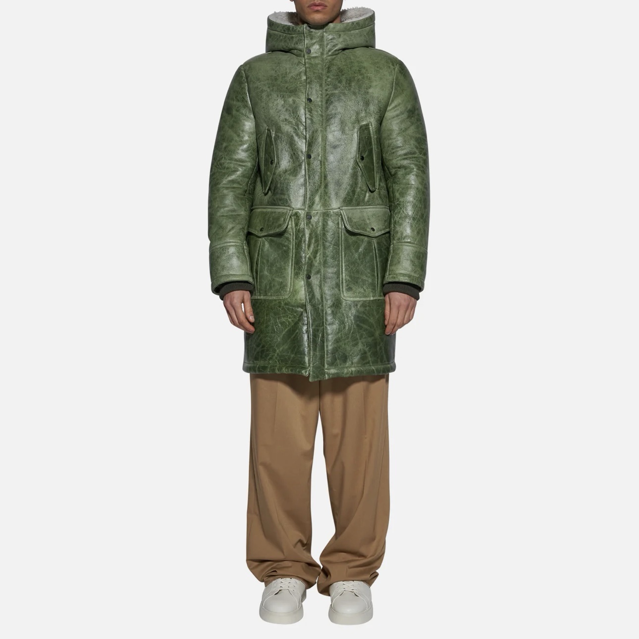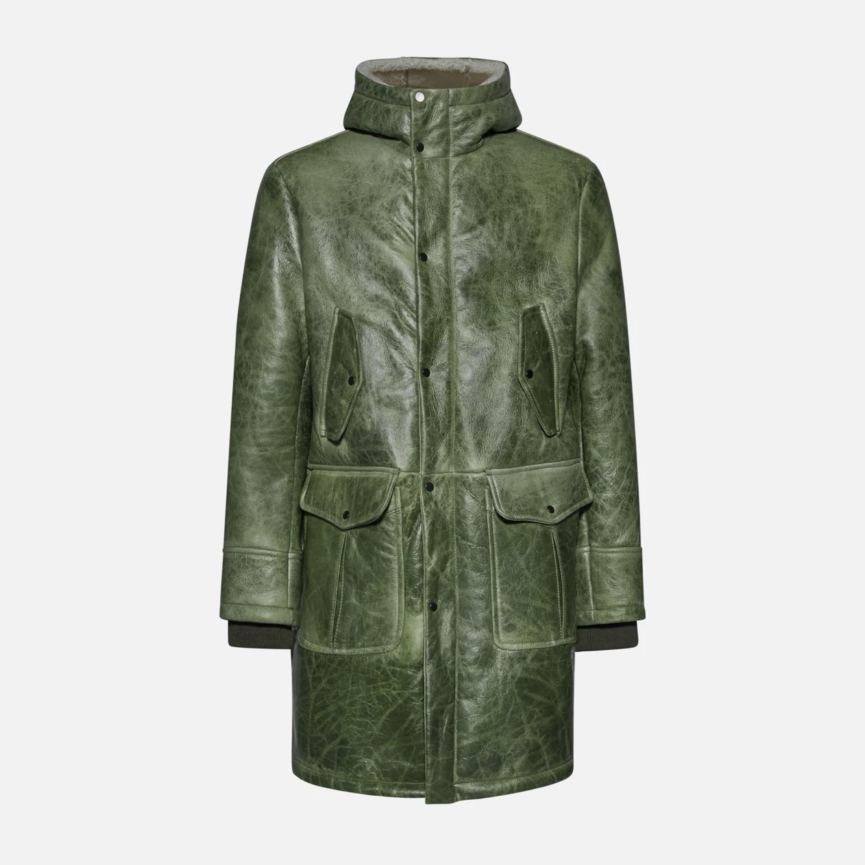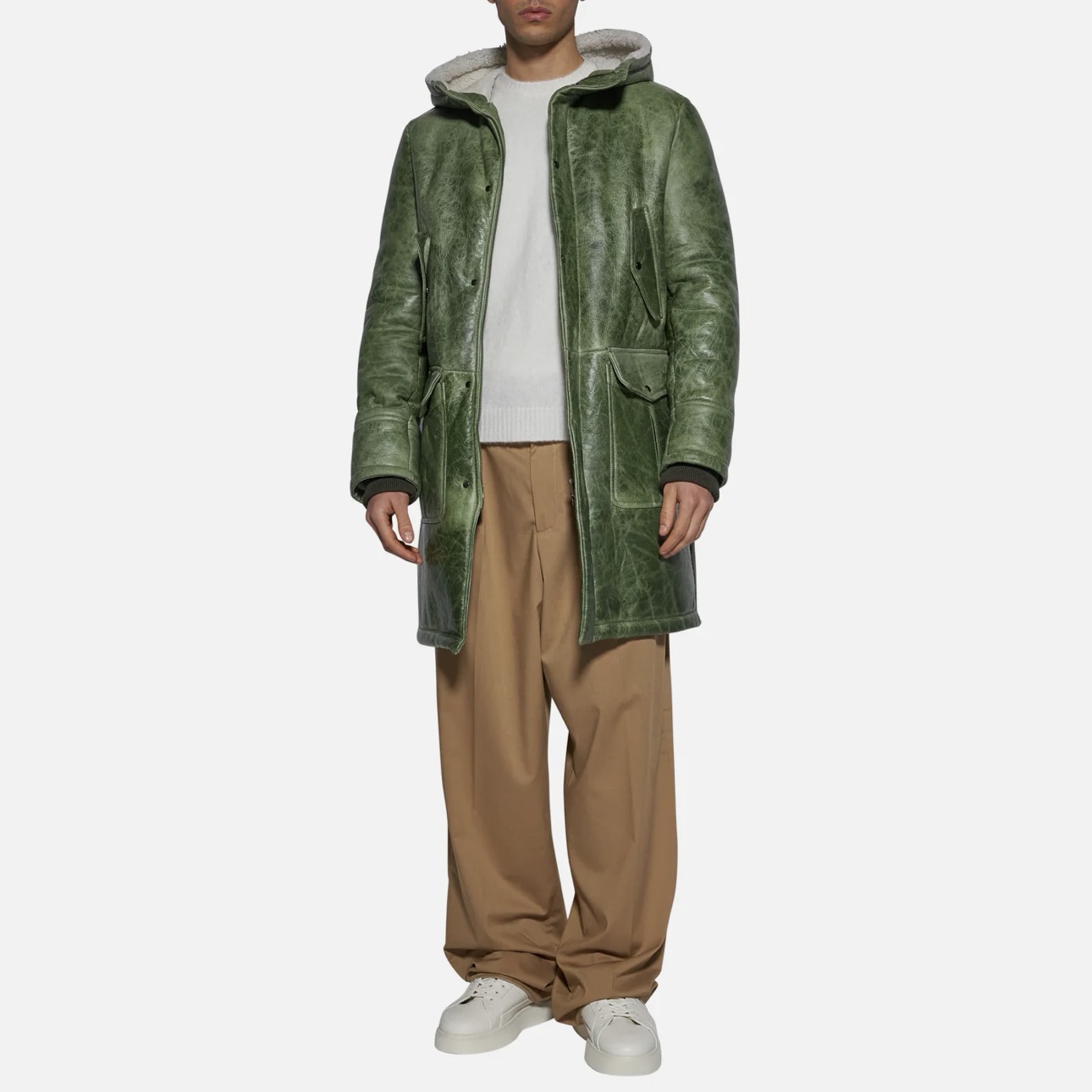 This green shearling parka, with a bold and distinctive design, is the perfect ally to face the winter in style. Crafted from premium shearling leather, the parka offers excellent thermal insulation, keeping you warm even on the coldest days. The integrated hood and hidden zip closure with press studs ensure protection from the wind and bad weather. The large front pockets with flap add functionality, making this garment ideal for the modern man who seeks style and practicality. The intense green color and shearling finishes make it a unique and refined garment