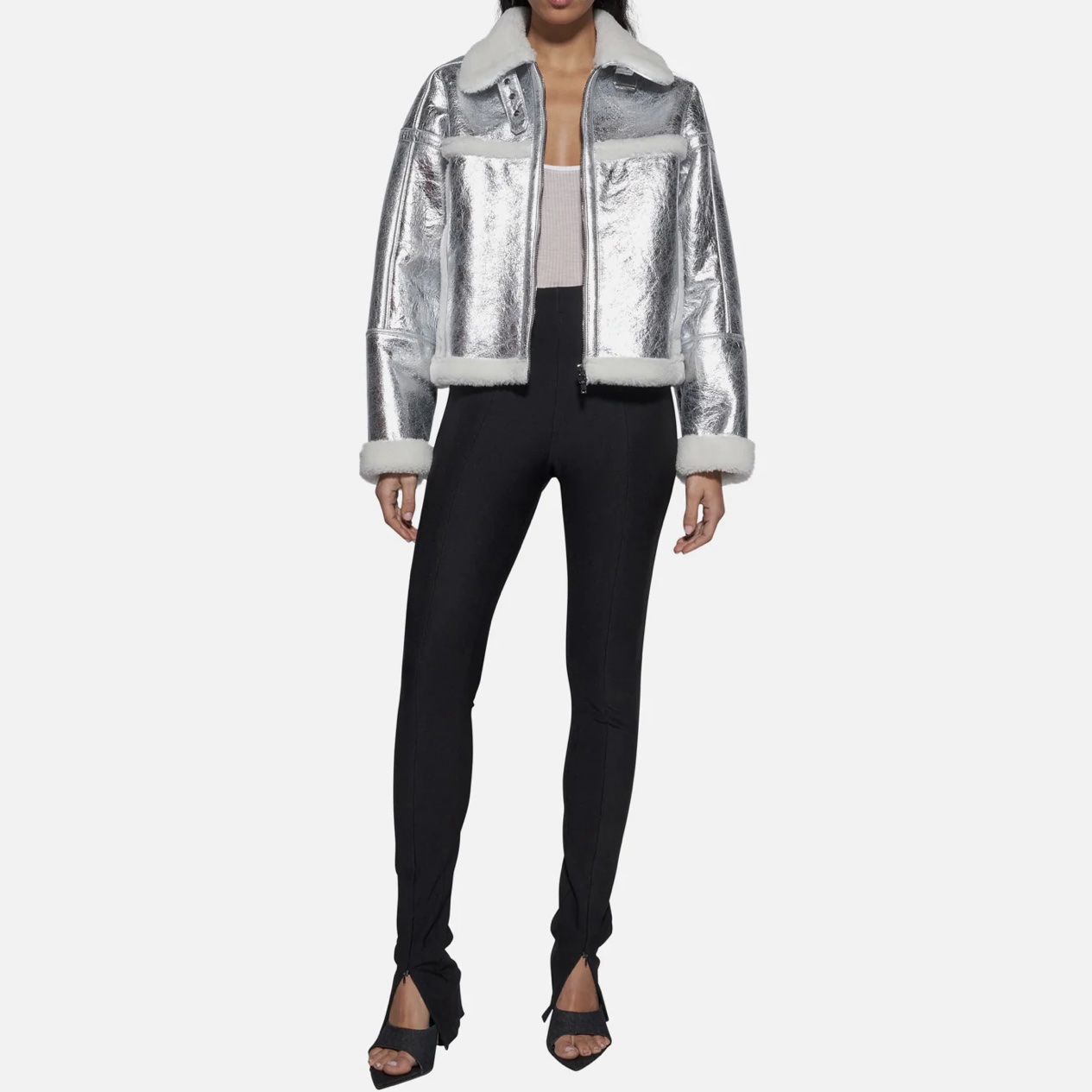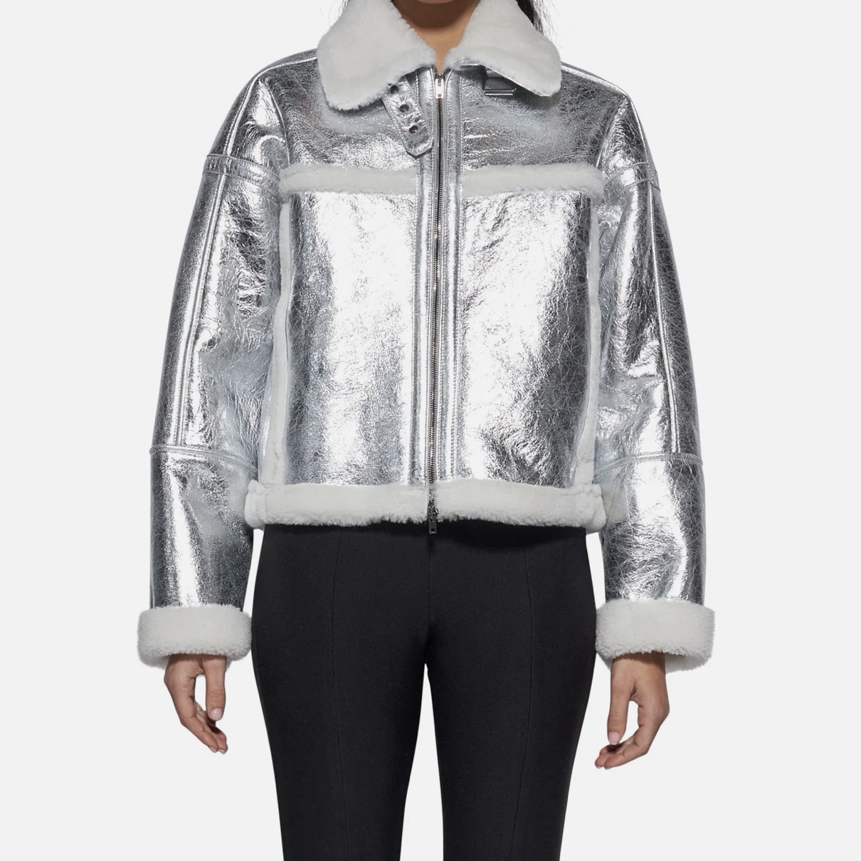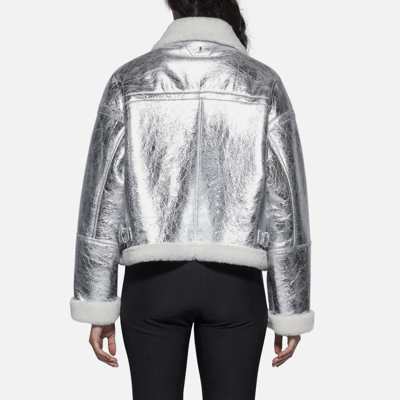 This shearling jacket stands out for its extraordinary silver foil coating, which gives it a futuristic and modern look. The contrast between the metallic coating and the soft white shearling offers a perfect mix of style and comfort. The white shearling collar, the roll-up sleeves and the central zip closure with buckle details complete the bold design. Ideal for those looking for an iconic and distinctive piece to face the winter with personality.