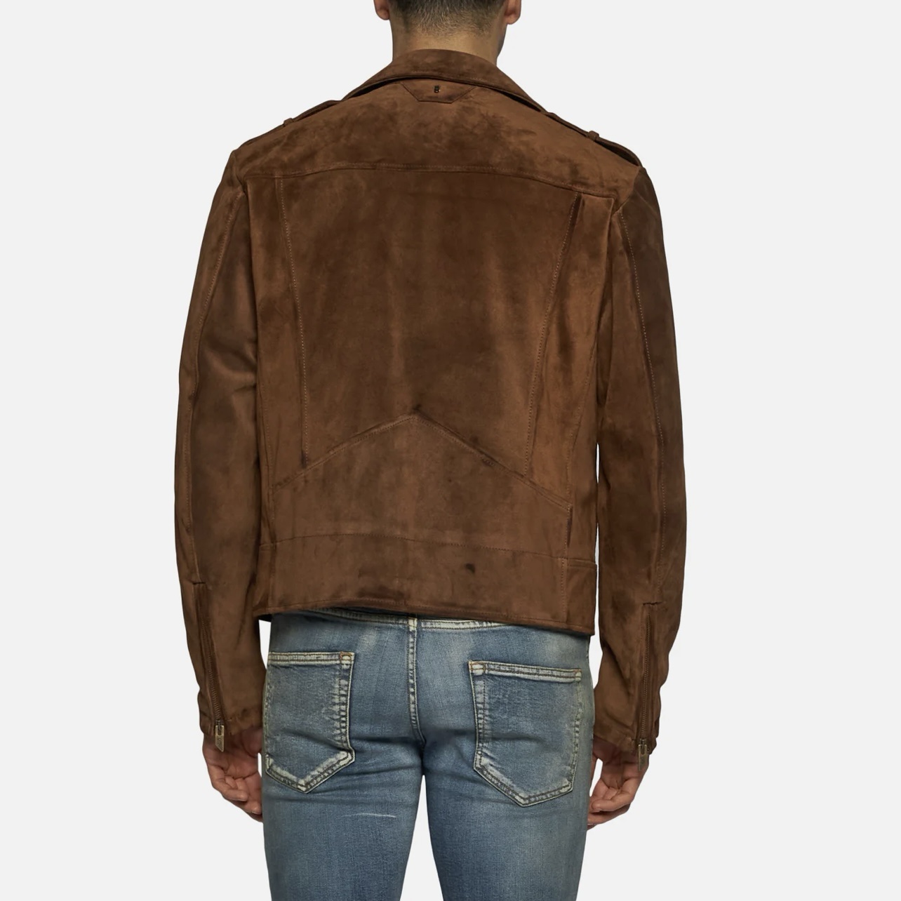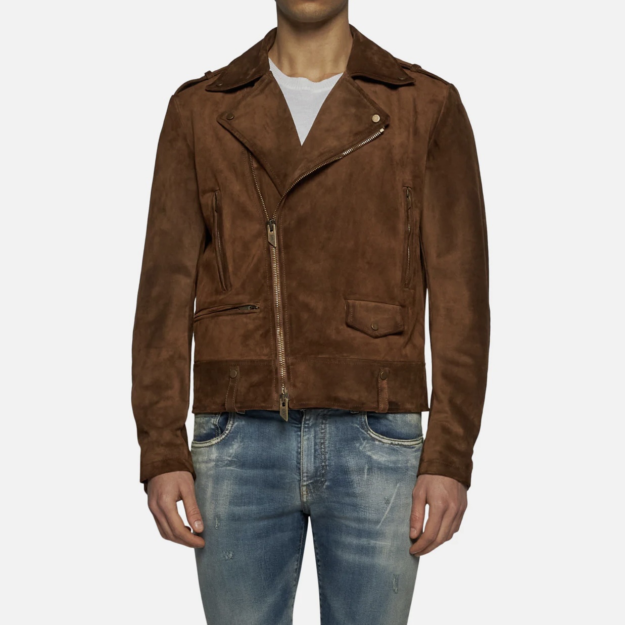 The brown suede Biker jacket is a must-have for those seeking a sophisticated and trendy style. Crafted from soft, premium suede, this jacket offers a velvety texture that lends timeless elegance. The design features an asymmetrical metal zip closure, reinforced shoulders and sleeve details that recall the classic biker style, revisited in a contemporary key. The slim fit perfectly hugs the figure, ensuring a tapered silhouette. The zipped cuffs and side zip pockets add practicality without sacrificing the refined design. Perfect for wearing on different occasions, it is a versatile garment that combines comfort and quality.