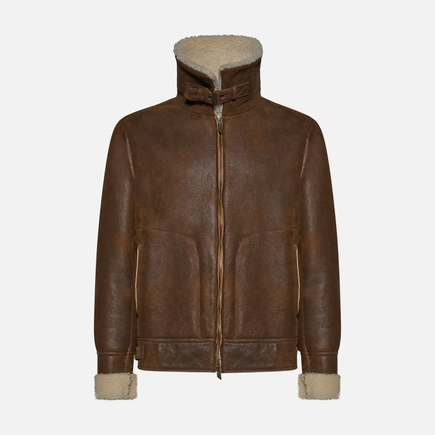 This shearling jacket features a light brown design, enriched by a contrasting light shearling collar and cuffs. Perfect for facing the cold, it offers comfort and warmth thanks to the quality of the materials used. The front zip and the side zip pockets increase its functionality, while the buckle detail on the collar adds a touch of decisive and contemporary style.
