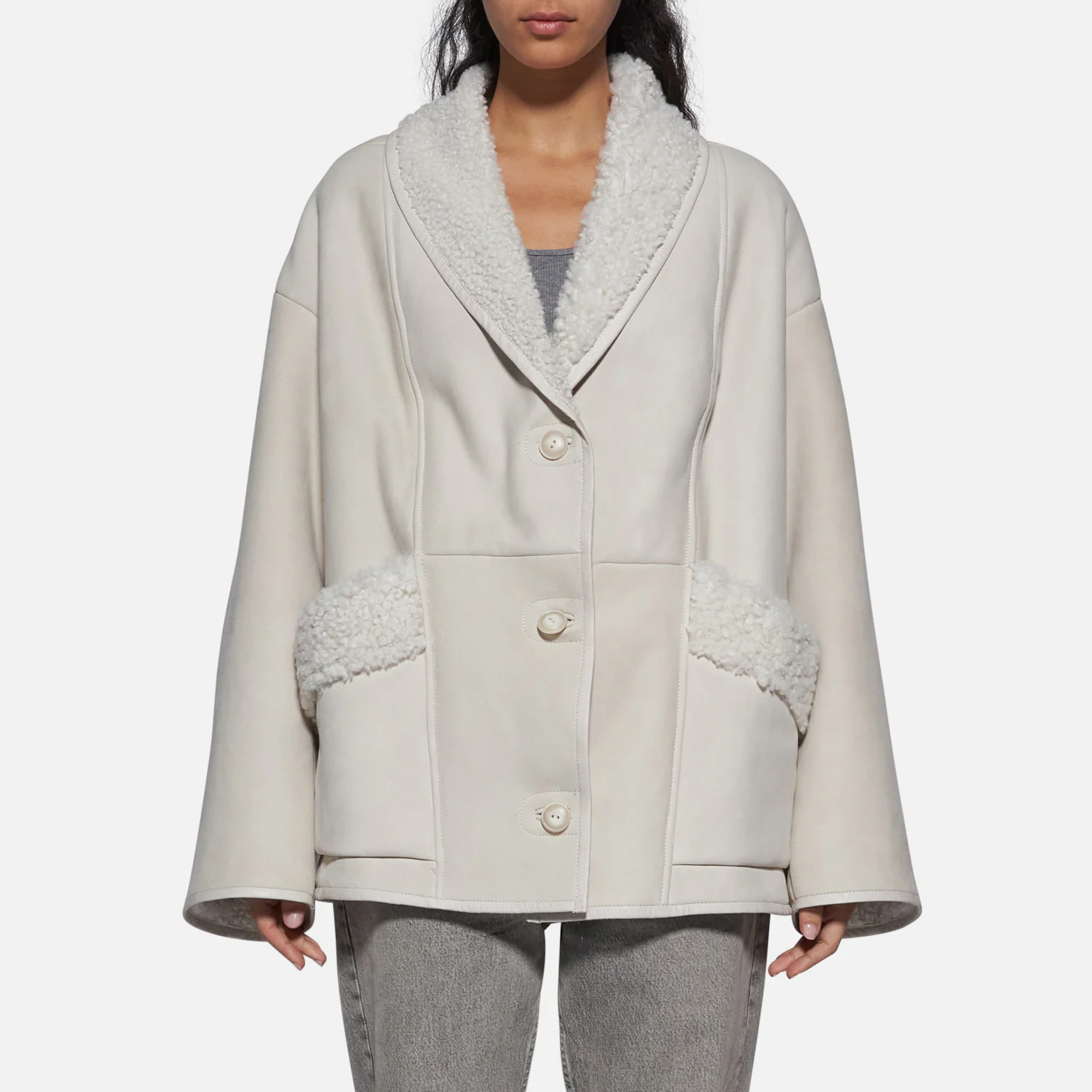 This off-white shearling jacket is the perfect choice for those seeking minimalist elegance and comfort without sacrificing warmth. Crafted from soft shearling, it offers excellent thermal insulation, perfect for tackling the cold season. The design features a large wrap-around collar and a button closure that gives it a classic and sophisticated look. The front pockets with shearling details add a touch of style and practicality. This jacket is a versatile piece, suitable for both casual outfits and more formal occasions, always maintaining a refined aesthetic.