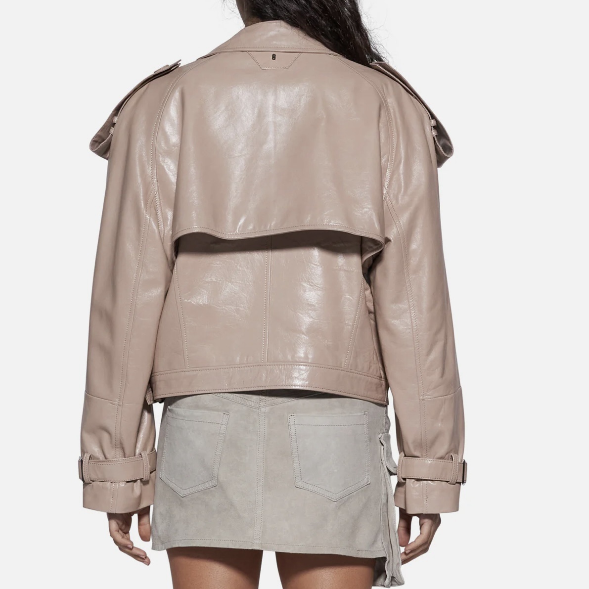 This nude leather jacket features a modern design inspired by classic style. Featuring a cropped cut and details such as side buttons and adjustable straps on the cuffs, it has wide lapels and decorative shoulder pads that add a touch of elegance. Crafted from shiny leather, this jacket stands out for its versatility and is perfect for both casual and more sophisticated looks.