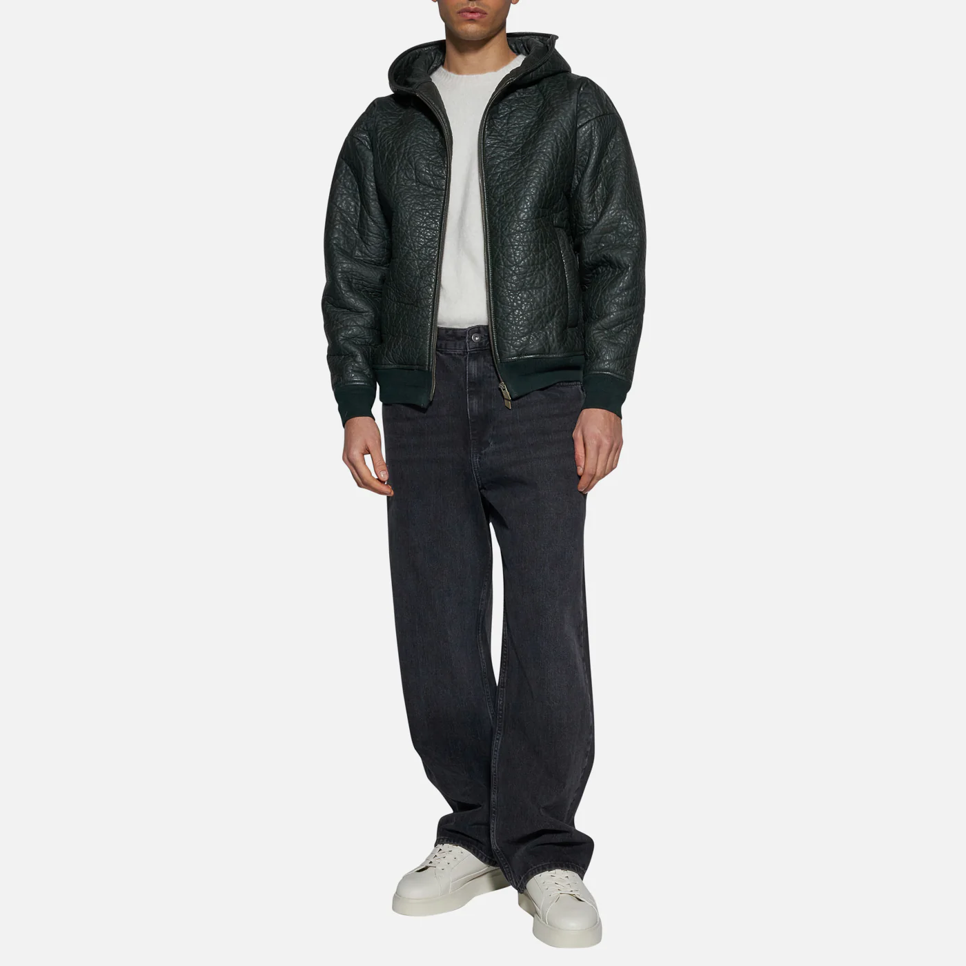 This textured black leather hooded jacket strikes the perfect balance between urban style and comfort. The leather texture adds a distinctive touch, while the integrated hood and zip closure provide everyday practicality. Ideal for those seeking a casual yet sophisticated look, this jacket is perfect for tackling the colder months with a touch of modernity. Ribbed trims on the cuffs and hem ensure a snug, comfortable fit. A versatile piece, suitable for both informal occasions and to add a bold touch to your outfit.