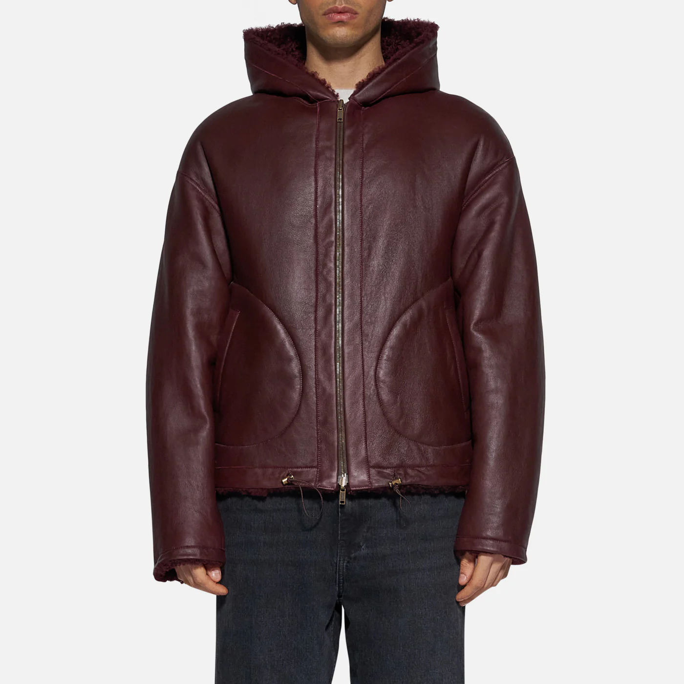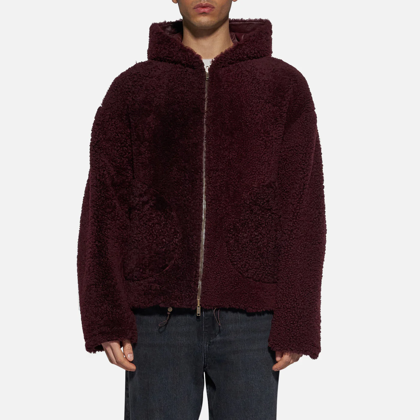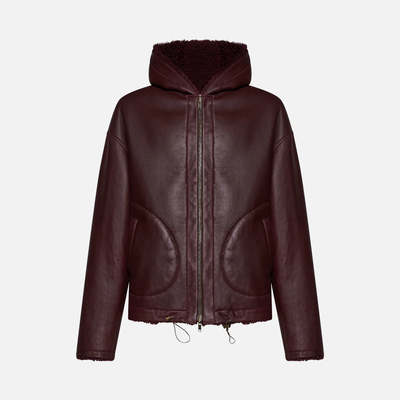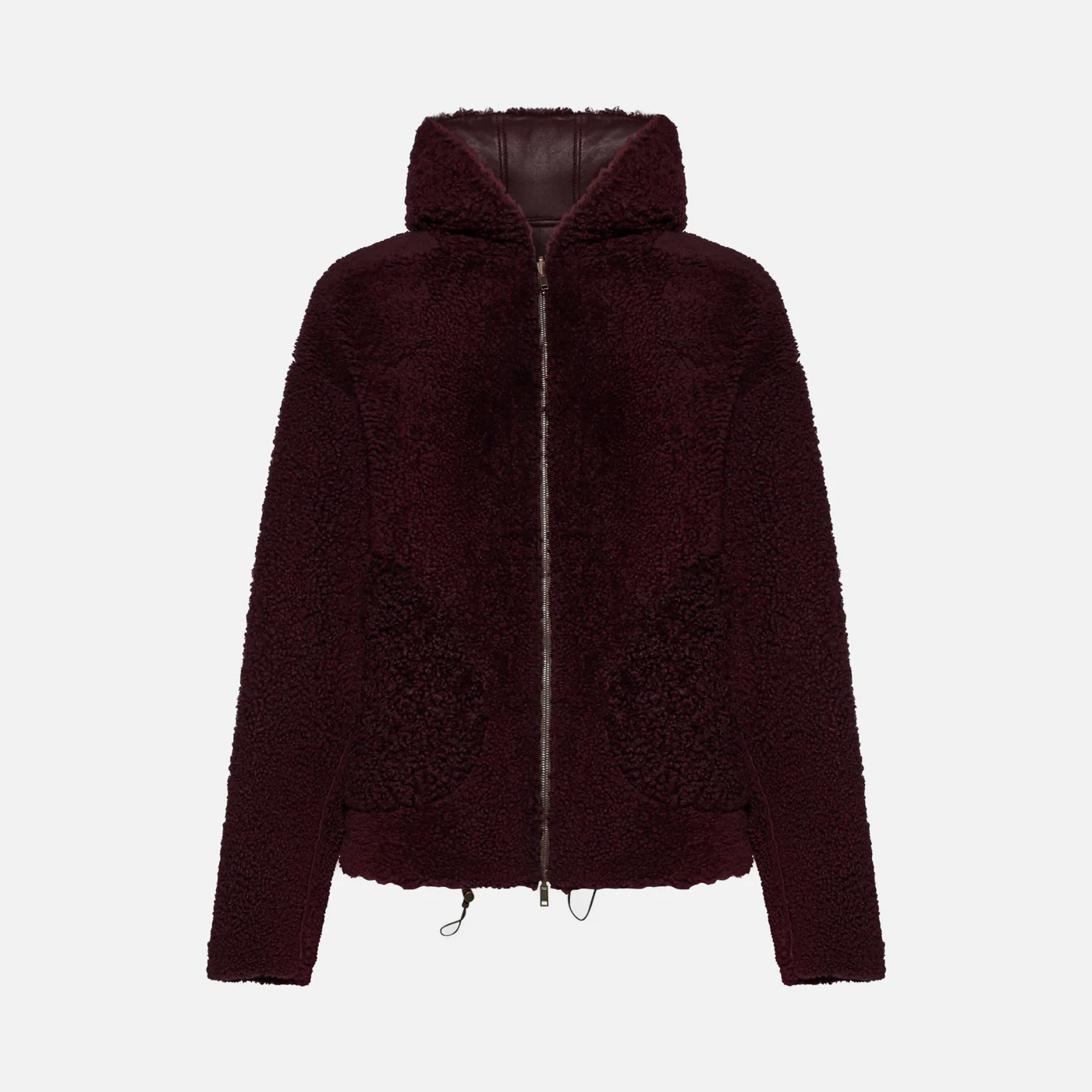 This reversible jacket is crafted from burgundy shearling, offering uncompromising versatility. On one side it features a soft shearling texture that provides warmth and comfort, while on the other side it has a cleaner, smoother aesthetic, likely in leather or textured fabric. The central zip closure and details on the cuffs and bottom make it practical and modern. Its reversibility makes it an extremely functional garment, suitable for both a casual and more elegant look.