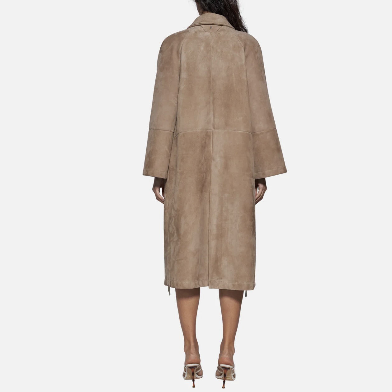 Brown suede coat. The minimal and clean design, with matching buttons and large front pockets, offers a sober and versatile look, perfect for any occasion. Crafted from high-quality suede, this coat not only offers impeccable style, but also exceptional comfort, thanks to the soft and resistant fabric. Ideal for those looking for a trendy garment without sacrificing functionality. Pair it with formal or casual looks for an outfit that is always refined and fashionable.